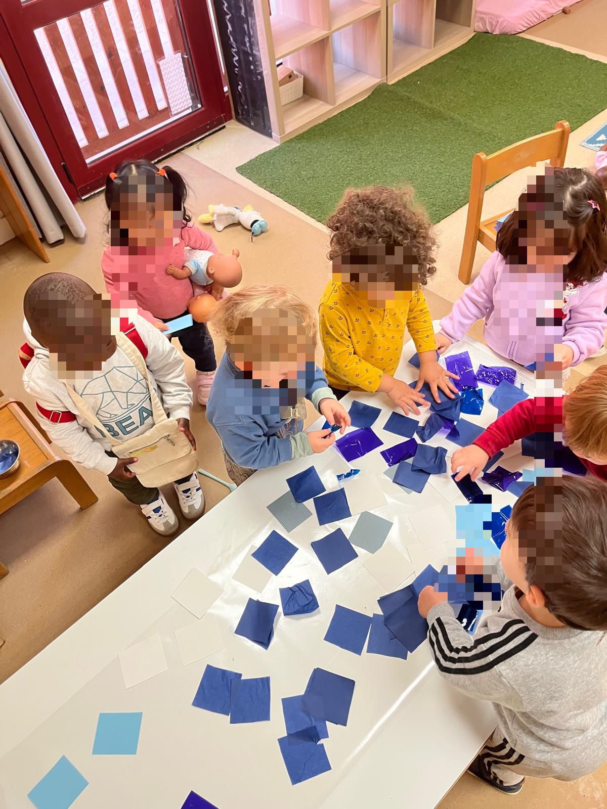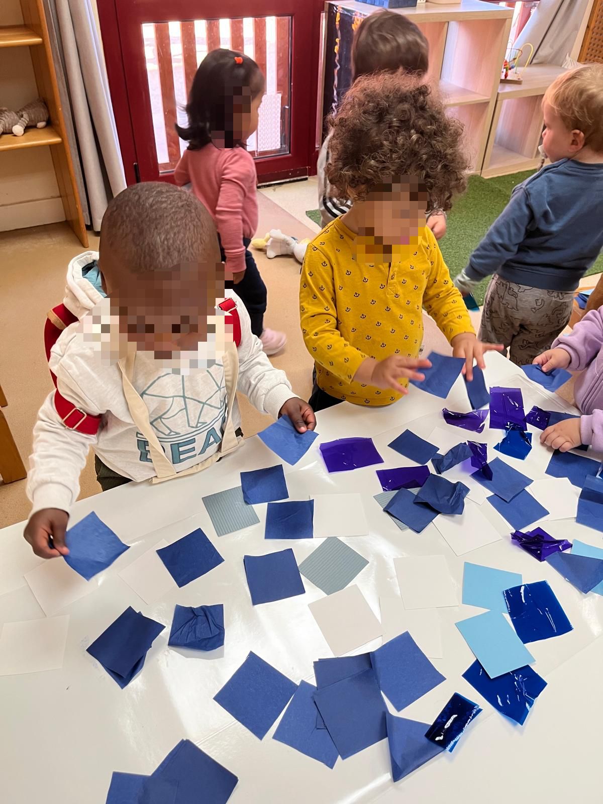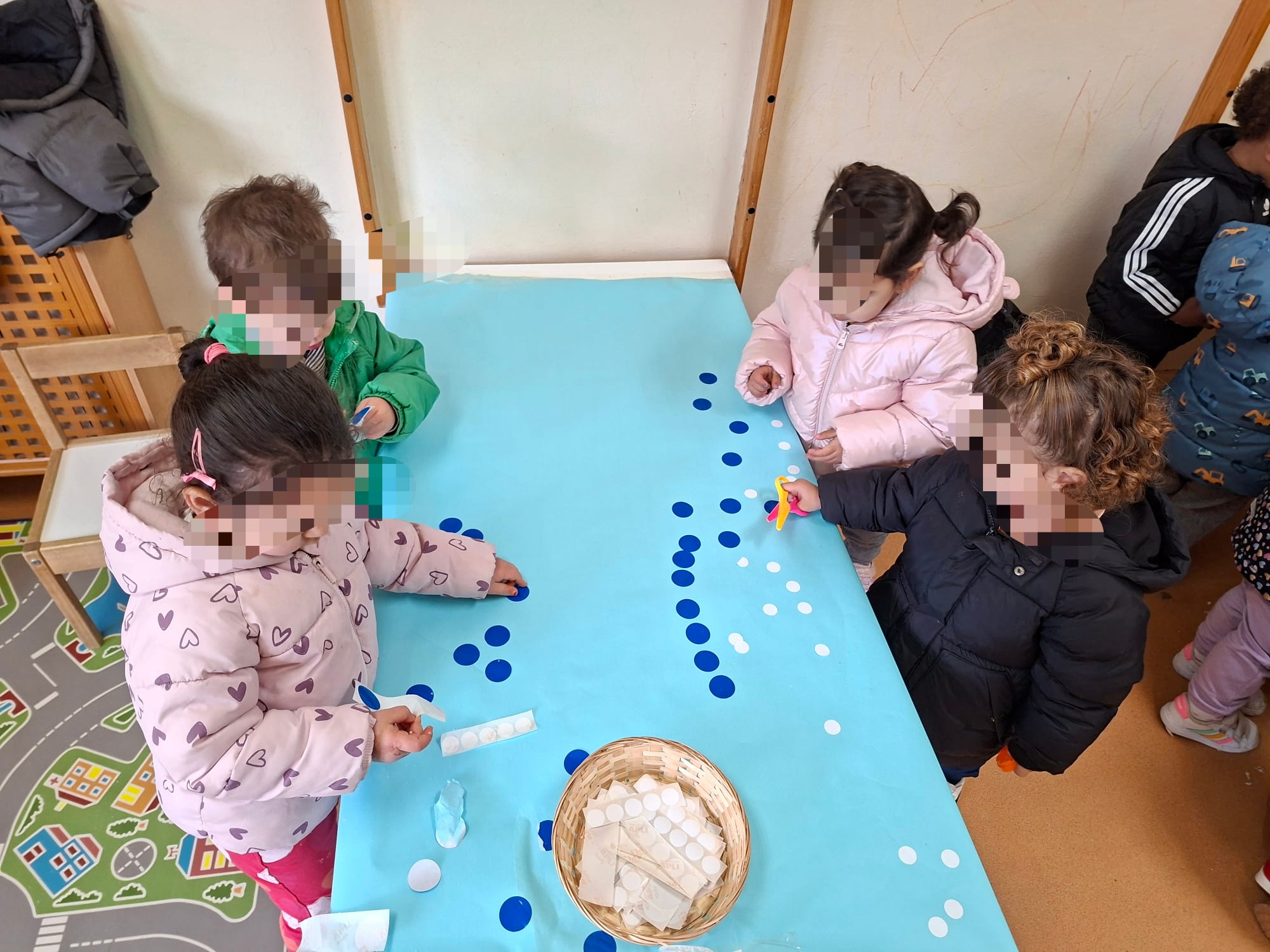 Pintant i enganxant gomets de colors freds com els blaus, blancs, violetes...