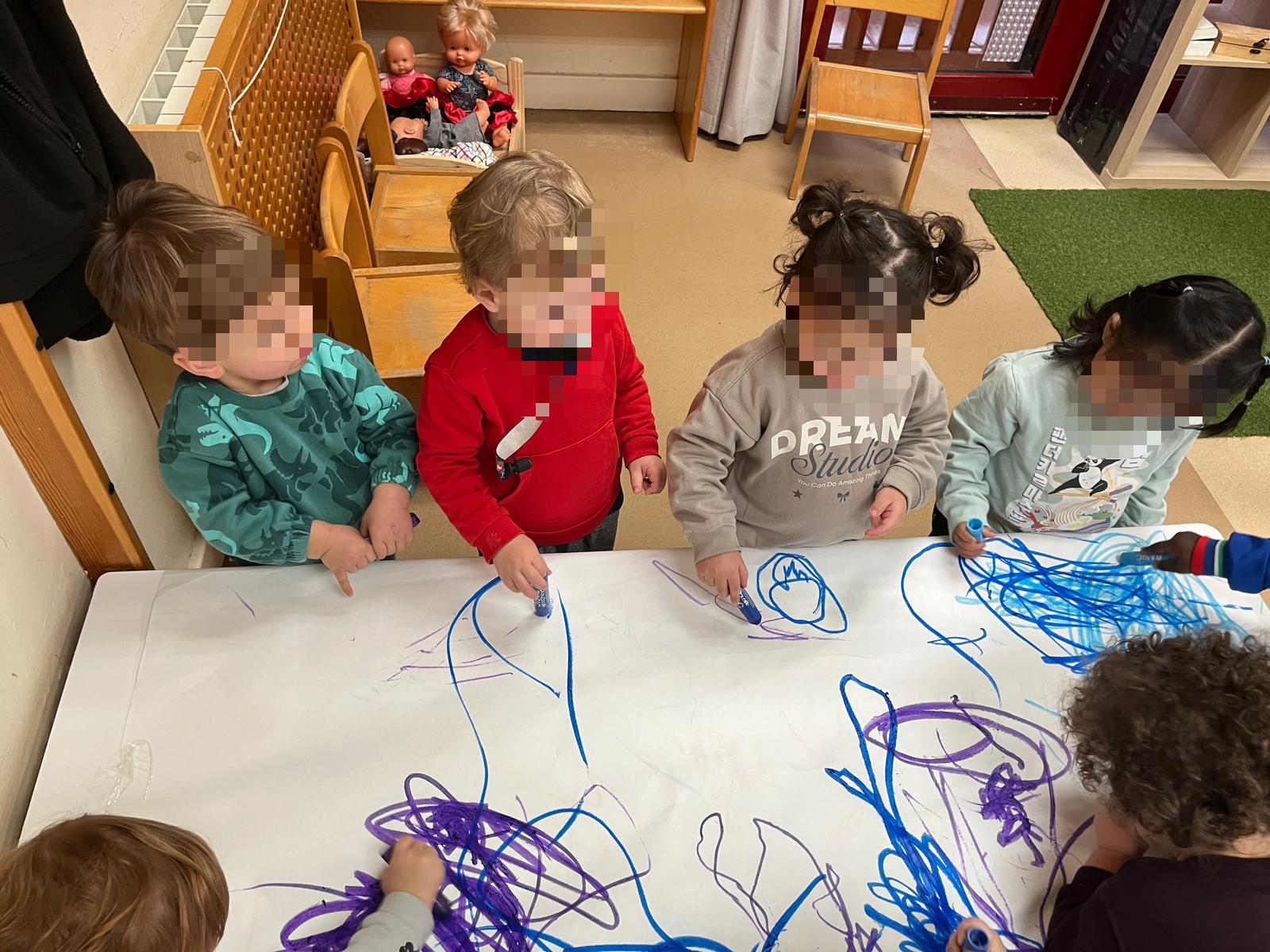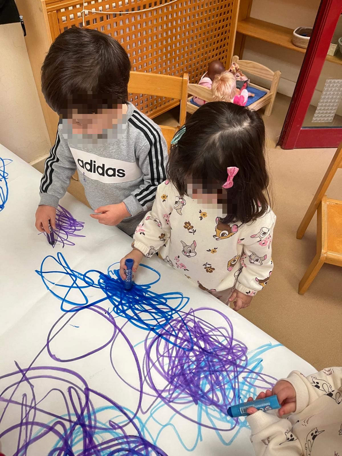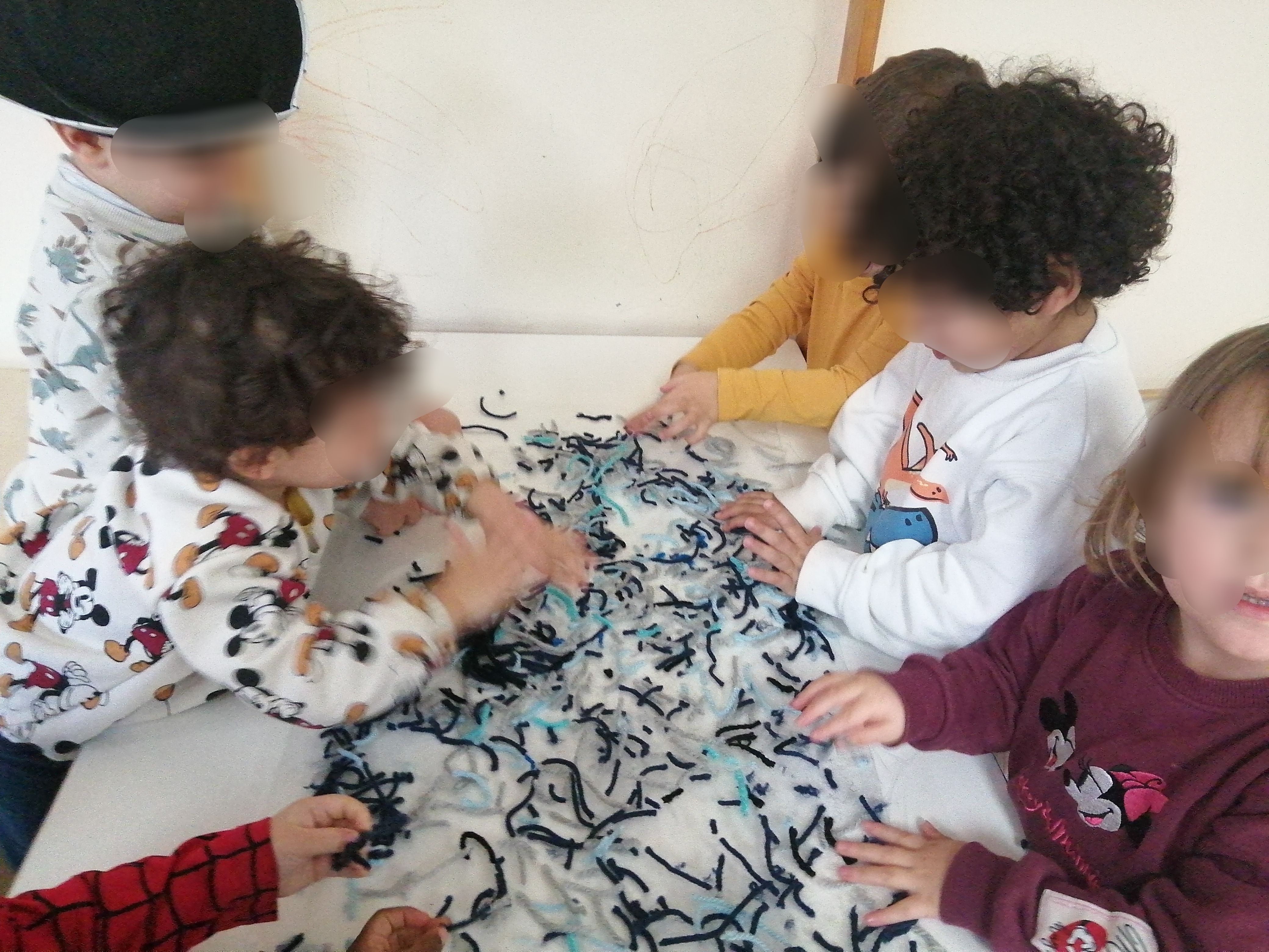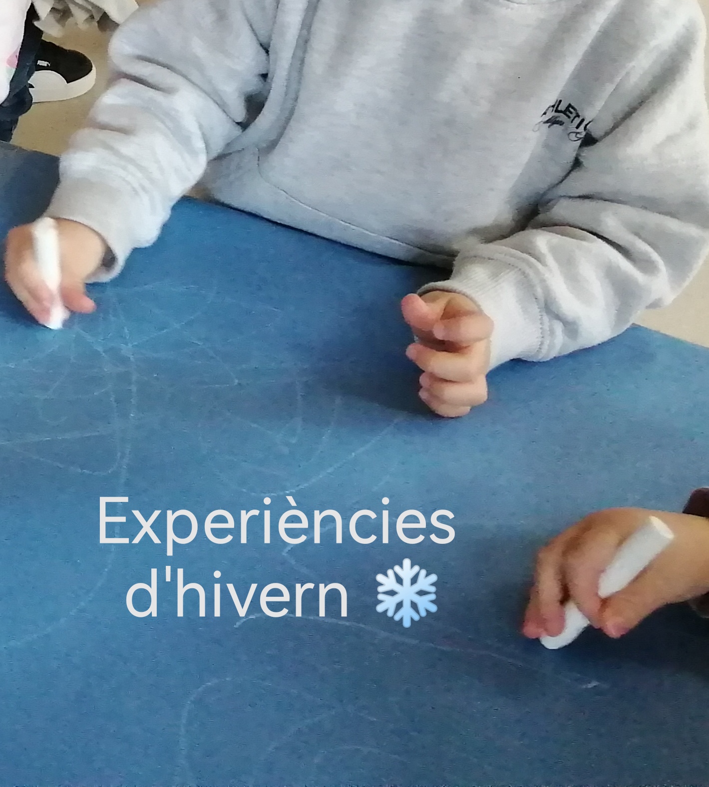 Pintant i enganxant gomets de colors freds com els blaus, blancs, violetes...